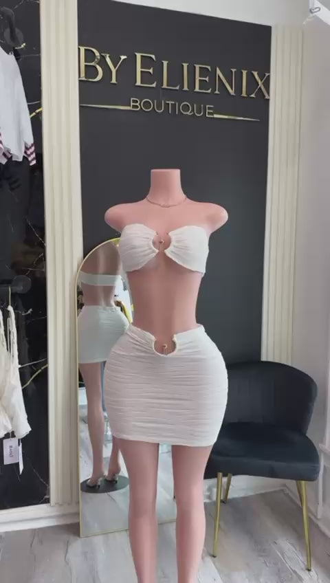 Set dos piezas en punto drapeado color marfil que abraza la silueta. Top bandeau fruncido con aro dorado y barra colgante al centro, realzando el escote sin necesidad de tirantes. Falda mini a juego con abertura frontal y mismo detalle metálico para un efecto de continuidad sexy-minimal. Tejido elástico, forro ligero y cierre posterior de cremallera invisible. Ideal para noches de verano con tacones nude y clutch dorado.