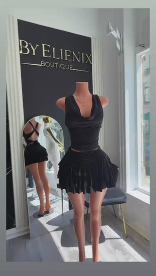 Set de dos piezas en negro. El top tipo cowl (escote drapeado) abraza el torso y luce una espalda cruzada súper sexy. La mini falda de cintura alta tiene frunces con cordones laterales y volantes en capas que dan movimiento. Tejido elástico y suave que estiliza la figura—perfecto para noche, fiestas y salidas de verano.