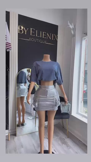Camiseta crop de jersey suave azul denim con microbrillos all-over que iluminan cualquier look. Silueta boxy/oversize, escote redondo y mangas amplias al codo para un fit relajado y súper cómodo. Perfecta para combinar con jeans, faldas o joggers y darle un toque casual-chic con brillo sutil.
