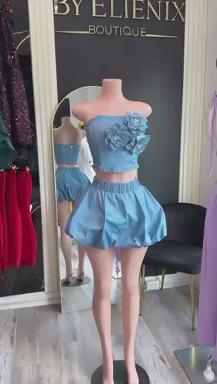 Este conjunto de dos piezas en mezclilla azul claro combina una blusa strapless con aplicaciones florales en 3D y una falda tipo globo. Es ideal para destacar con un look coqueto, fresco y lleno de detalles únicos.