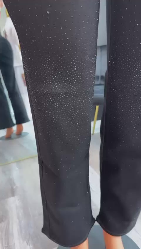 Pantalones denim negro con corte entallado y detalles sutiles de brillo tipo glitter. Elegantes, modernos y con un toque llamativo para elevar cualquier look nocturno o casual chic.