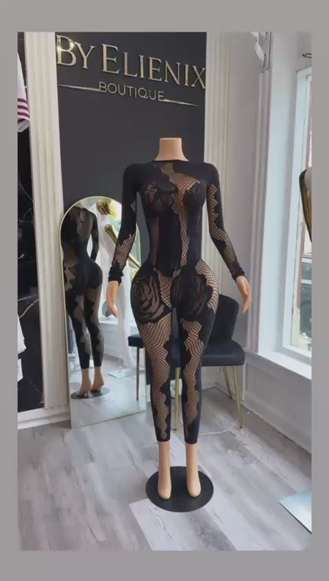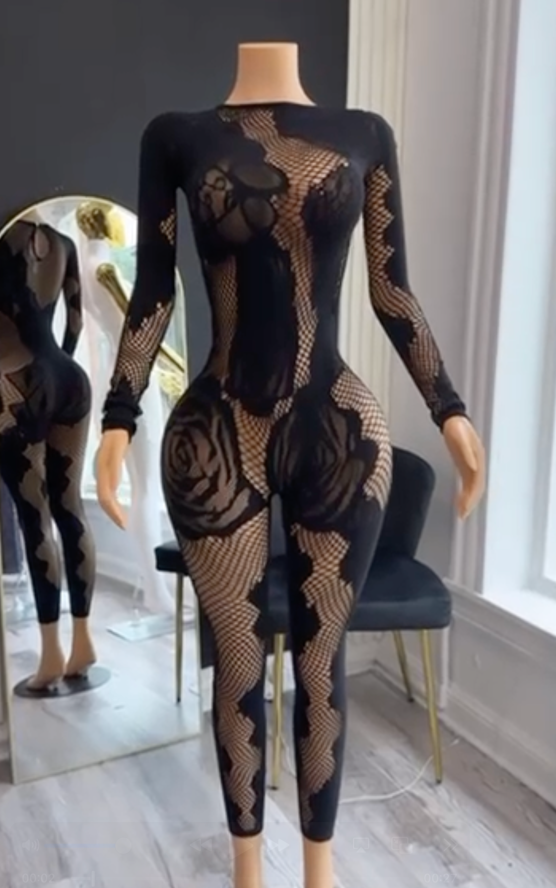 Jumpsuit ceñido de malla negra con juego de transparencias tipo fishnet y motivos de rosas que dibujan la silueta. Manga larga, cuello redondo y pierna ajustada para un look audaz y elegante. Perfecto para usar con bodys o lencería debajo en noches de fiesta o fotos.