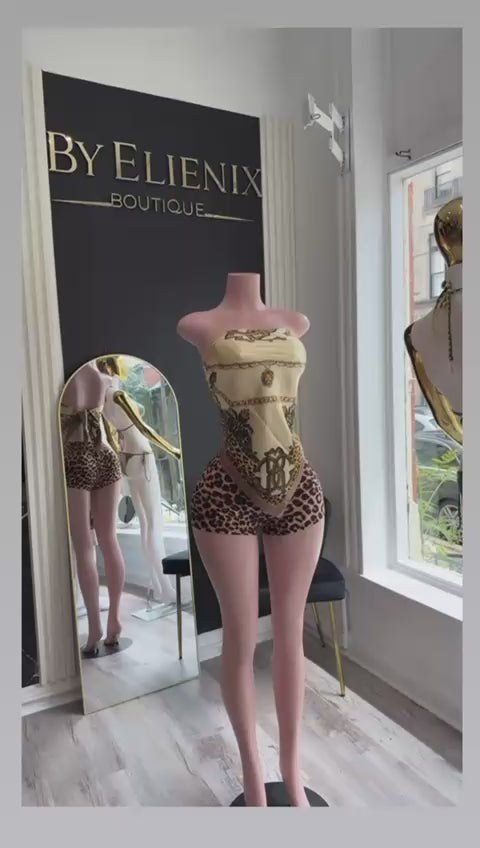 Set de dos piezas ultra-atrevido: top estilo pañuelo de satén beige con print de cadenas tipo joya y bajo en pico, combinado con shorts ajustados de leopardo elástico. Lúcelo en fiestas, festivales o salidas nocturnas y presume de silueta felina con un toque de lujo italiano.