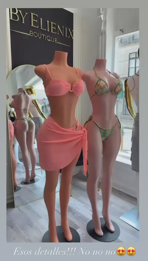 Bikini triangular de inspiración boho en tonos esmeralda y dorado que realza tu bronceado y añade un toque chic con sus detalles ric-rac y charms metálicos.