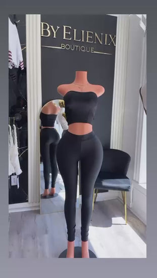 Conjunto de 2 piezas en negro: top tipo banda sin tirantes con ajuste firme y paneles que estilizan, y leggings de tiro alto con cinturilla ancha que define la silueta. Tejido suave y elástico (4-way stretch) de compresión media, cómodo y sin transparencias. Versátil para athleisure o salidas casuales: combínalo con tenis, chaqueta denim o tacones para un look de impacto.