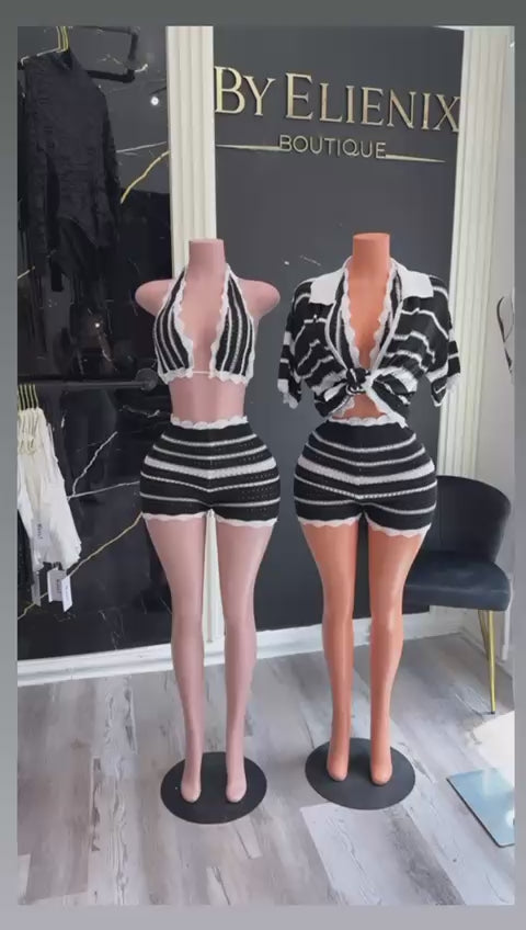 Conjunto tejido a rayas blanco-negro que mezcla vibra náutica y sensualidad: bralette halter, shorts cintura alta y bolero cropped para anudar o llevar suelto.