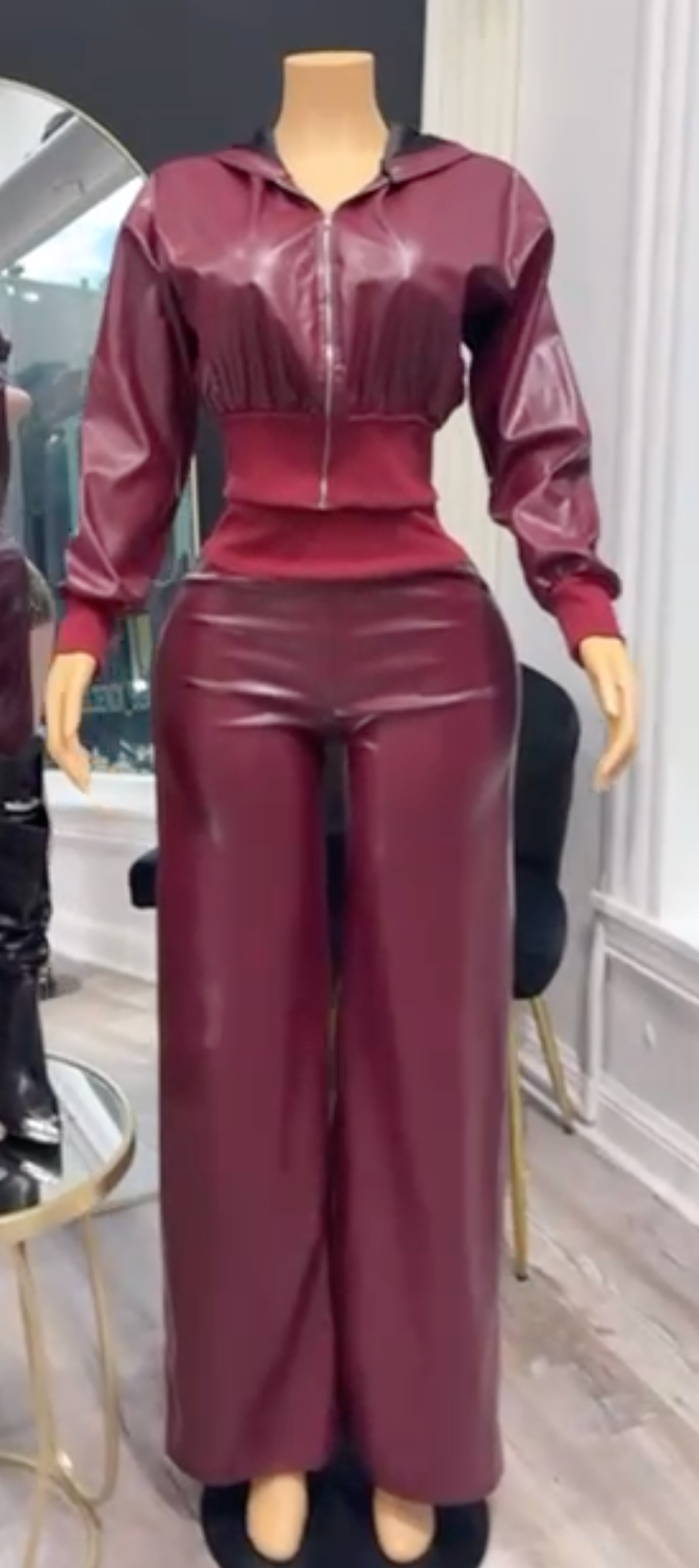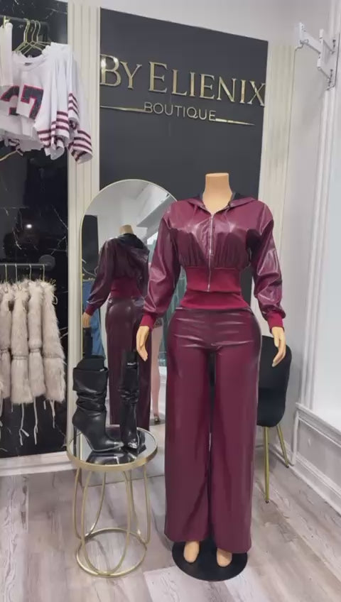 Conquista la noche con este conjunto dos piezas en efecto cuero burdeos. La chaqueta cropped con capucha y cierre frontal define la cintura, mientras el pantalón de tiro alto y pierna ancha alarga la silueta con un brillo sofisticado. Perfecto para outfits poderosos: desde una salida con tacones hasta un look de concierto con botines.