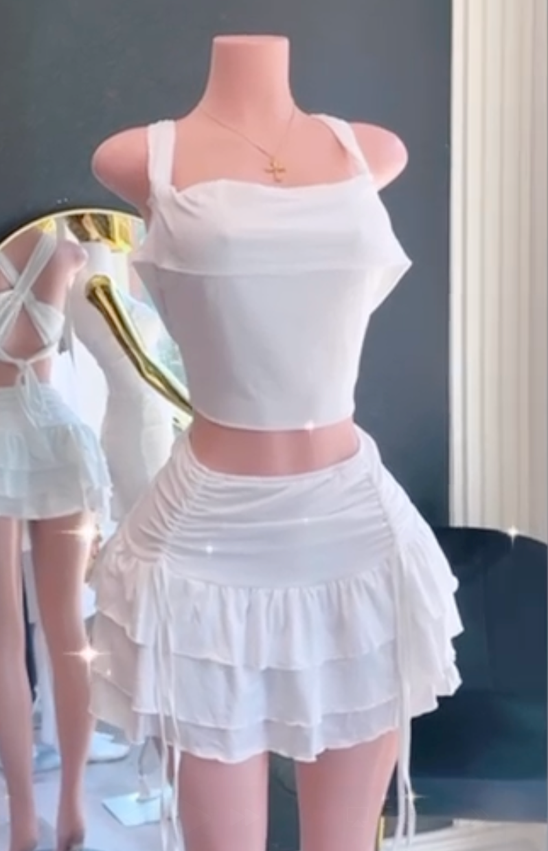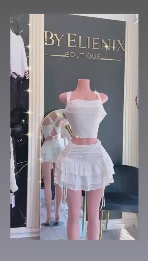 Conjunto de dos piezas en blanco luminoso: crop top de tirantes con caída drapeada y mini falda con volantes en capas y frunces laterales ajustables. Tejido ligero y elástico que realza la cintura y se mueve contigo—perfecto para verano, brunch o vacaciones.