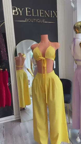 Conjunto de top halter con tirantes largos y pantalones fluidos de tiro alto en amarillo vibrante. Perfecto para días soleados, eventos tropicales o destacar con energía positiva.