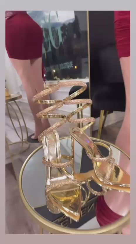 Brilla con cada paso. Sandalia stiletto en acabado dorado espejo con tiras transparentes y pulsera espiral tipo serpiente que abraza la pierna para un look ultra glam. Diseño de punta fina, plantilla ligeramente acolchada y talón abierto para estilizar la figura sin sacrificar comodidad. Perfectas para fiestas, bodas y noches donde quieres ser el centro de atención.