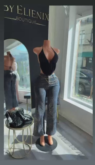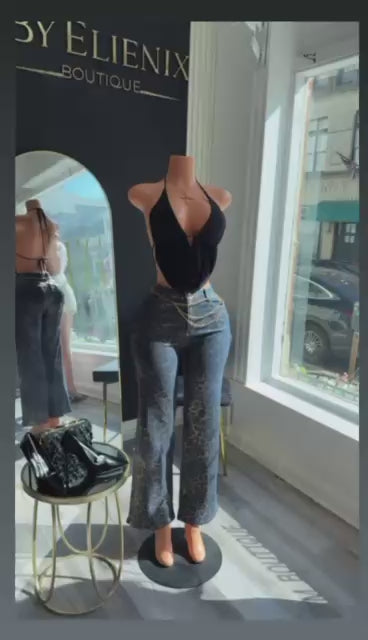 Este top negro con escote profundo y caída drapeada es perfecto para una noche de estilo y confianza. Su diseño halter realza la figura y ofrece un toque elegante y seductor, ideal para combinar con jeans o faldas de tiro alto. Ligero, fresco y versátil para cualquier ocasión especial.