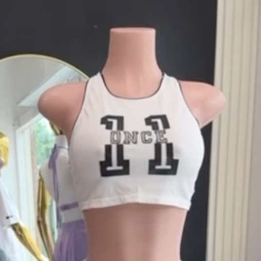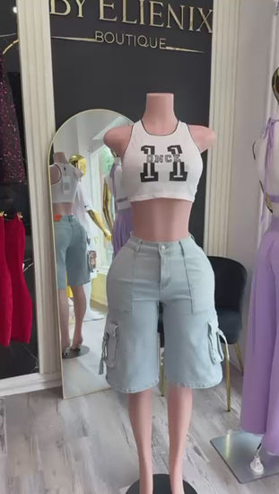 Resalta tu lado sporty con este crop top blanco de tirantes gruesos y escote halter. El estampado “ONCE” estilo universitario le da un toque juvenil y atrevido, ideal para combinar con jeans o pantalones cargo para un look urbano y casual.