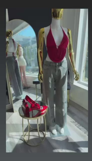 El top “Crimson Drape” combina sensualidad y elegancia en un diseño halter con escote profundo y caída fluida. Su color rojo vibrante resalta la piel y añade un toque atrevido a cualquier look. Perfecto para salidas nocturnas o eventos especiales, fácil de combinar con jeans o pantalones ajustados para un estilo chic y moderno.
