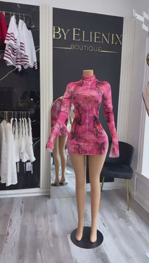 Mini de malla elástica con estampado artístico en tonos fucsia, coral y toques negros que crean un efecto acuarela hipnótico. Cuello alto y mangas largas ligeramente acampanadas para un look sofisticado, mientras el corte bodycon resalta curvas. Forro suave que evita transparencias; cierre trasero invisible. Combínalo con botines negros o sandalias metálicas para destacar en cenas, cócteles o salidas nocturnas.